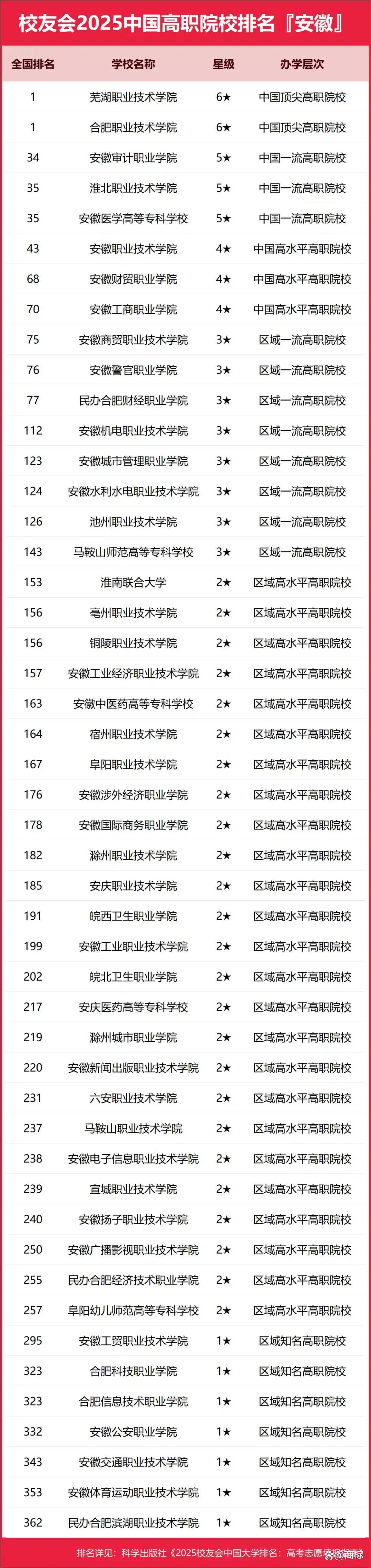 百家乐是全球玩家最喜欢和最吸引人的娱乐之一(永久网址:363050.com)本站提供百家乐游戏,在线百家乐,百家乐在线注册网址,百家乐平台推荐,百家乐试玩平台,百家乐官网链接,百家乐app下载,欢迎注册发财2025年校友会中国高职院校排名近日揭晓,安徽省45所高职院校交出了一份亮眼的成绩单。在这场体现职业教育综合实力的竞赛中,芜湖职业技术学院以全国第1的排名领跑全省,安徽职业技术学院位列全国第43,而池州职业技术学院以126名的成绩显著领先铜陵职业技术学院的156名。这些排名的变化,折射出安徽职业教育高质量发展的新格局。